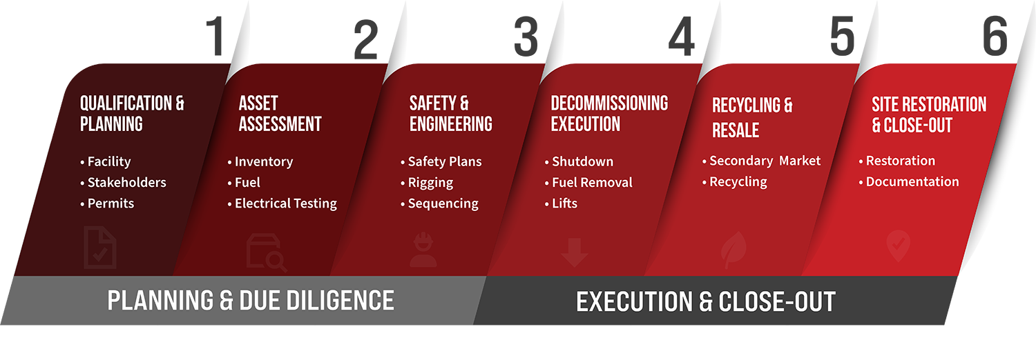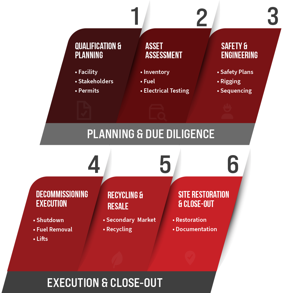 During the actual decommissioning, units will be shut down, fuel removed, and parts will be recycled whenever possible for the secondary markets. The decommissioning process often includes removing auxiliary cooling and fuel systems, transformers, switchgear, control panels, instrumentation, mounting structures and safety equipment, compressors, pumps, conveyors, and material handling systems.